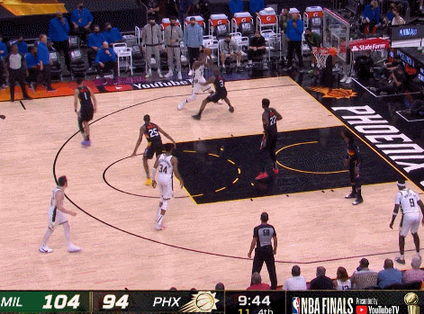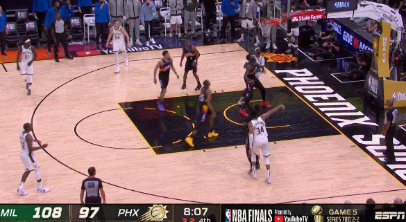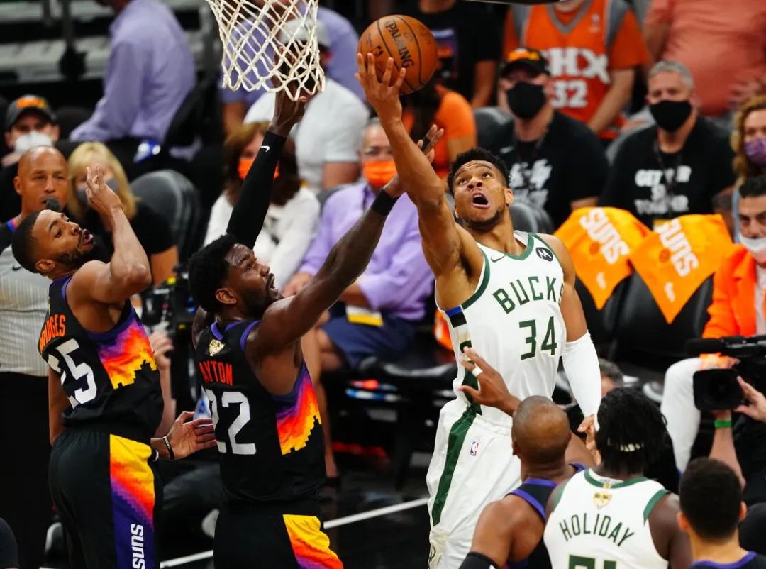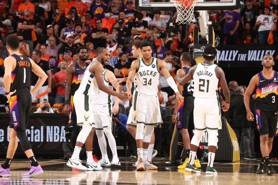 所以才有了布克最後打進反超的機會,但字母的封堵讓布克第一時間猶豫了,於是霍樂迪直接從布克懷裏把球生斷下來,最終出現了字母空接致勝的一幕。