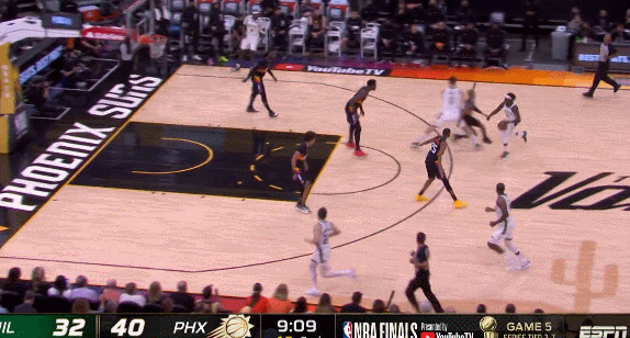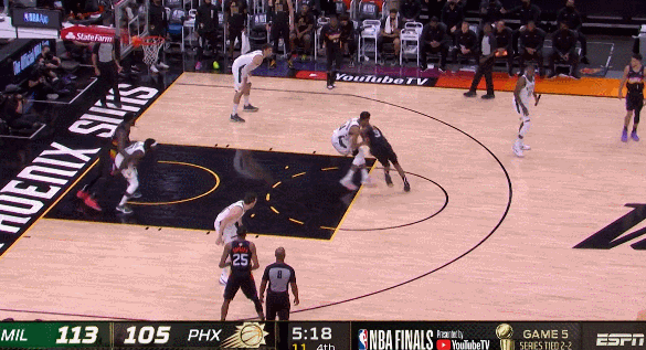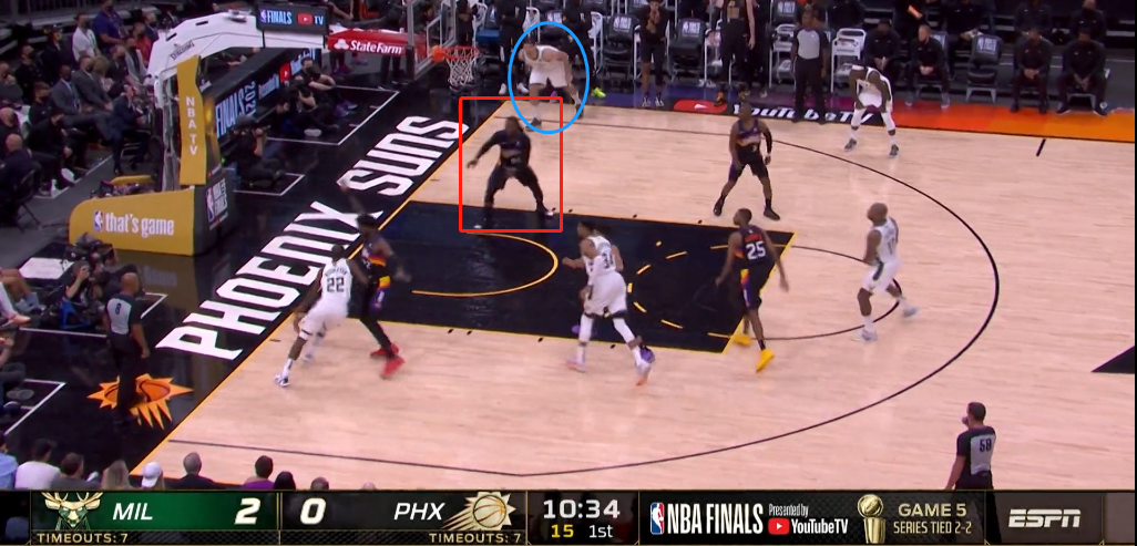 那麼太陽今天的調整是,弱側底角的防守人直接也收到籃下保護籃筐,所以雄鹿開局三次想給內線的大洛傳球都被截斷了。