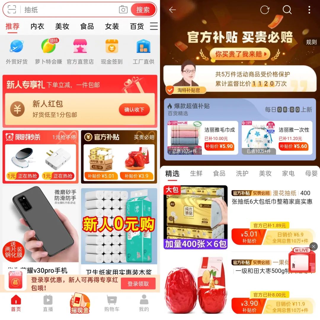 今年5月,淘特上線“官方補貼”頻道,帶有“官方補貼”標識的商品若符合條件將享受“買貴必賠”。淘特正在將平台價格拉到與拼多多同一水平面上,培養起淘特同樣“低價”的心智,再用“好貨”把用户留下來。