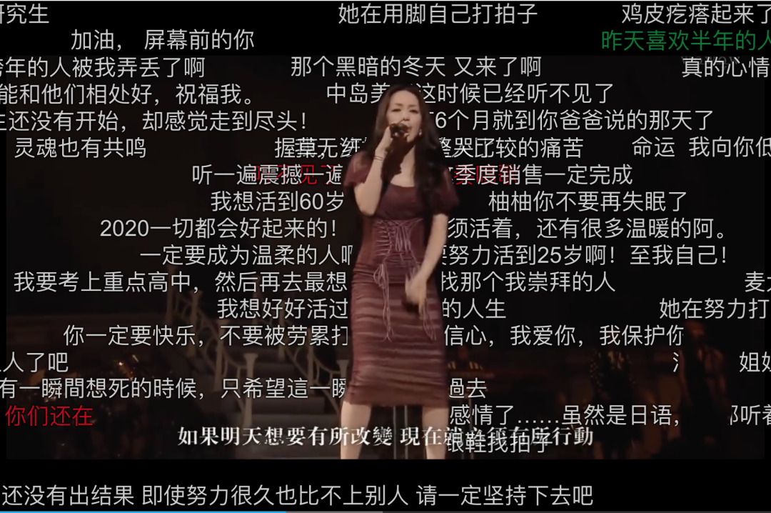 美嘉現場表演的視頻在bilibili播出後,整個畫面都被密密麻麻的彈幕擠滿,全是來自網友各種鼓勵感慨的話語。