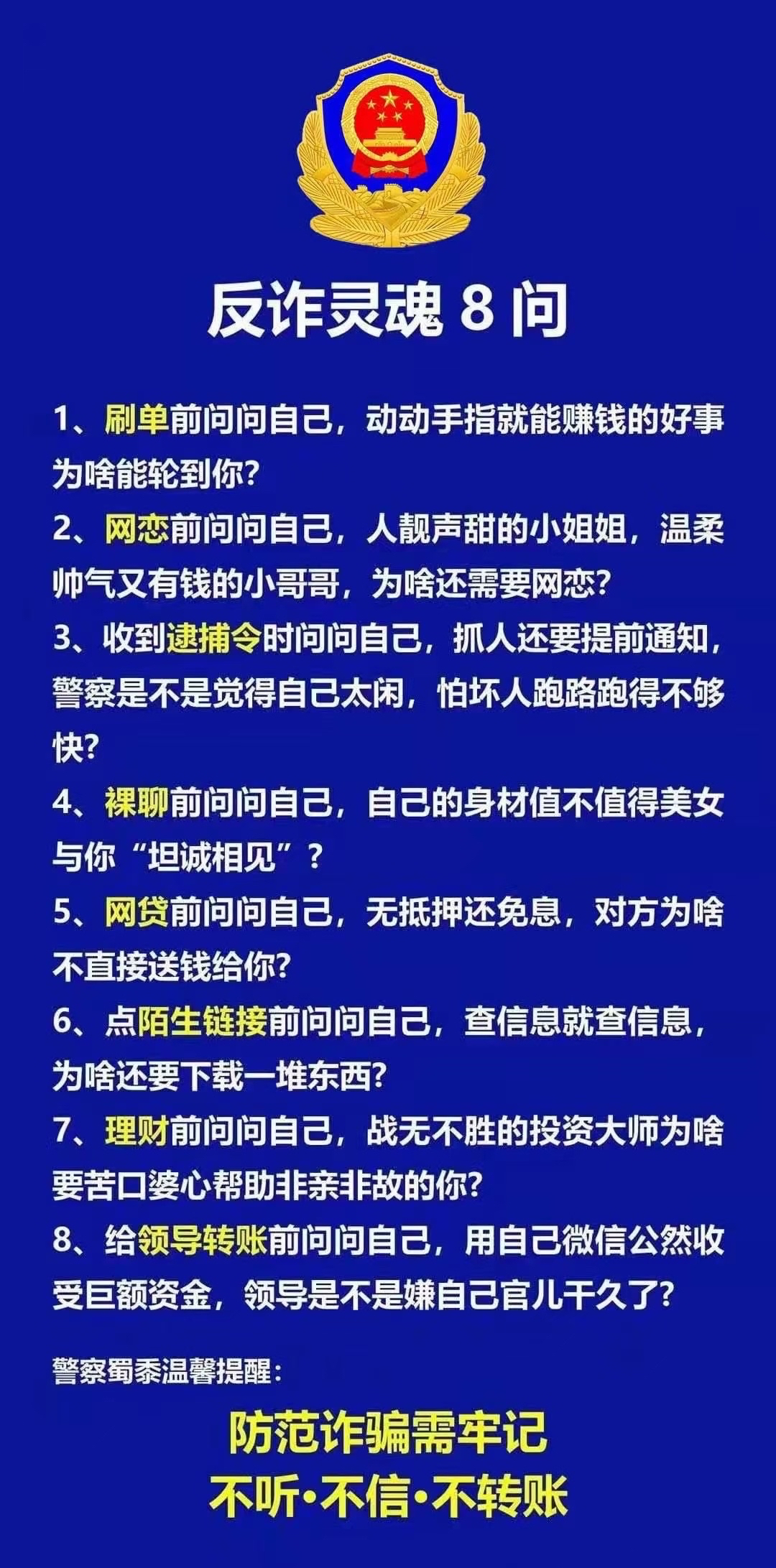 最後送你警察叔叔整理的“反詐靈魂8問”;