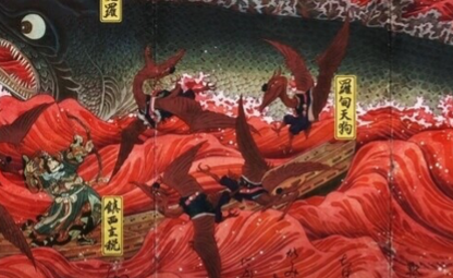 △ 尾逃市傳統壁畫上的“羅甸天狗”形象(上)與從天而降的翼龍哥斯拉(下)對比