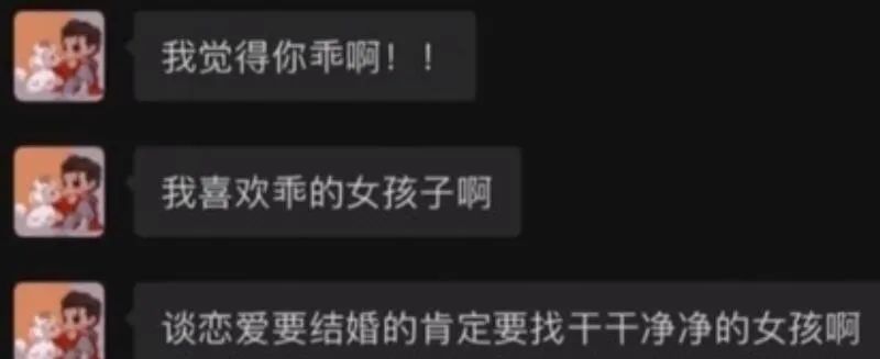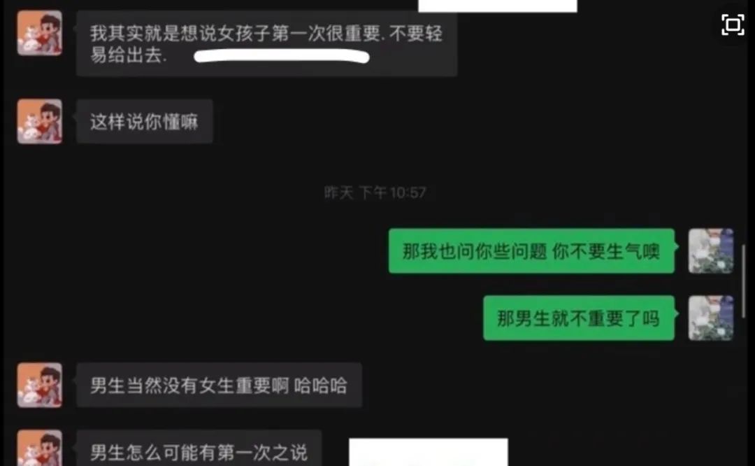 明裏暗裏的問女生是不是處女,説女生的第一次很重要,男生的無所謂,説自己想好好談戀愛,是奔着結婚去的,想要找乾乾淨淨的女孩結婚。