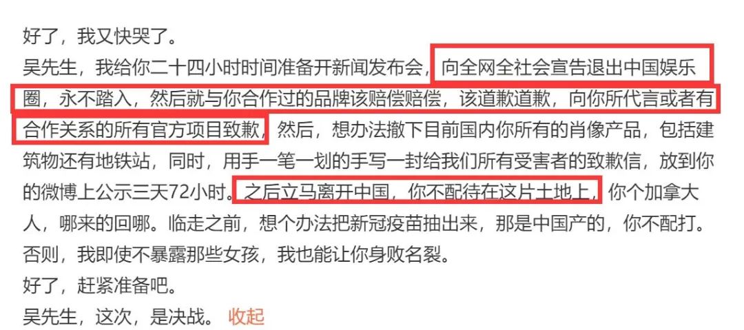 昨天都美竹在微博上表示希望吳亦凡退圈,公開道歉,離開中國等等,輿論支持達到了一個巔峯。