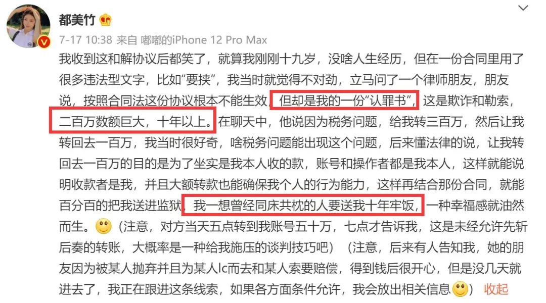 幾個女孩和頂流的團隊周旋,肯定要留個心眼。都美竹把對方提供的和解協議給律師朋友看了,這一看真的嚇到了,對方的協議根本是無效的,反而會成為都美竹的“認罪書”,很可能會把她送進去坐上十年大牢。