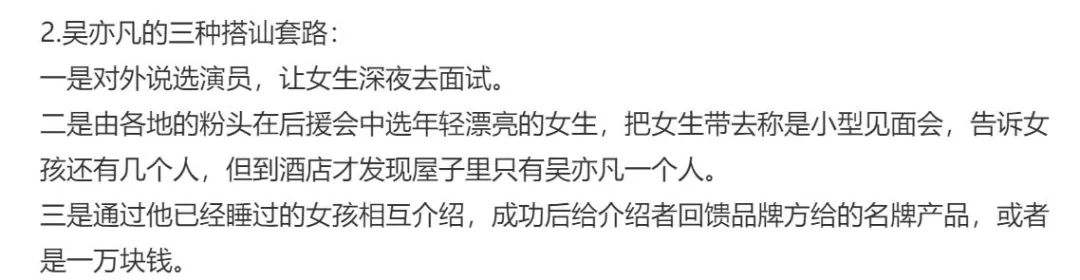 而且吳亦凡和女生發生關係從來不戴套,承諾給女生的資源也從沒給到。
