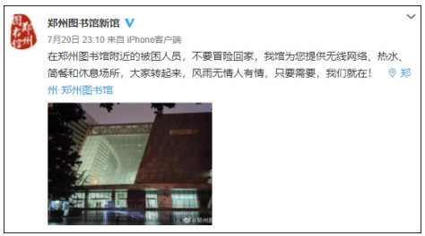 晚上23點,鄭州圖書館發帖提醒附近被困人員不要冒險回家,圖書館將提供無線網絡、熱水、簡餐和休息場所。鄭州科技館等公共場所隨後也開放了區域留宿市民。