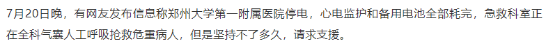 晚上21點22分,“@白菜兔兔丸女孩”在微博上求救:“爸爸現在氣管插管戴着呼吸機躺在河醫11號樓呼吸科重症監護室裏。家屬因暴雨被困家中,無法得知醫院內的情況。如果醫院一直沒恢復供電,呼吸機無法正常運作,非常擔心爸爸這種呼吸重症患者能夠堅持多久?”