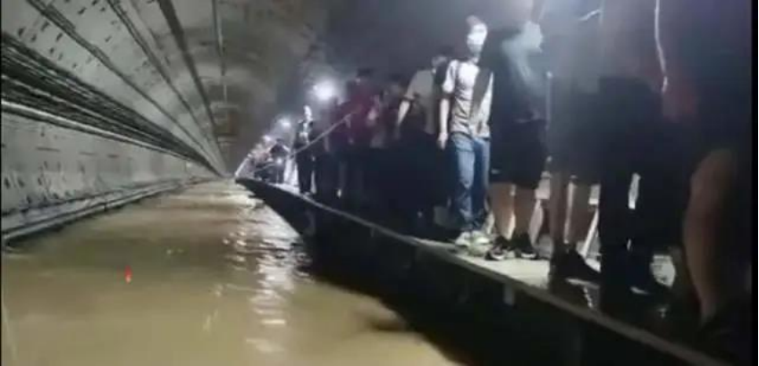 但此時,5號線海灘寺街站和沙口路站區間有一輛列車已經因為洪水被鎖死在軌道上,進退不得。乘客被困車廂。