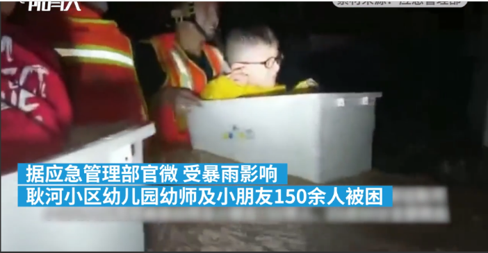 受暴雨影響,耿河小區幼兒園150餘名幼師和小朋友們被困。消防員們急中生智,用收納箱和塑料盆當“船”,把所有小朋友救出,運往安全地帶。