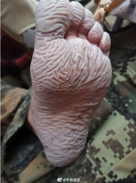 此時很多武警河南總隊機動支隊官兵連續奮戰十幾個小時,腳早已被泡浮腫。