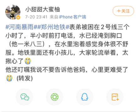水位持續上升,逐漸沒過胸部甚至頭部。“@奇蹟奇緣”聽到旁邊大媽給家人打電話交代銀行卡號,估計是後事。於是自己也開始發微信給家人交代後事。