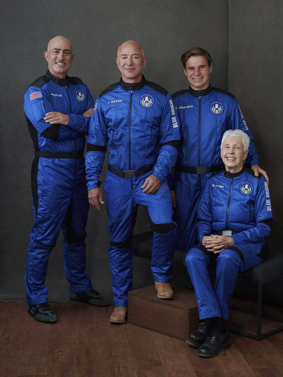 2021年7月20日訊,藍色起源公佈太空遊四人合影:貝索斯弟弟馬克·貝索斯(Mark Bezos)、亞馬遜創始人傑夫·貝索斯、18歲荷蘭小夥奧利弗·達蒙(Oliver Daemen)以及82歲傳奇女飛行員沃利·芬克(Wally Funk)(圖源:視覺中國)