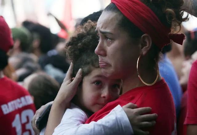 4月7日,在巴西聖貝爾納多-杜坎普的巴西鋼鐵工人工會總部前,巴西前總統盧拉的支持者掉下眼淚(圖源:新華社發 拉赫爾·帕特拉索攝)