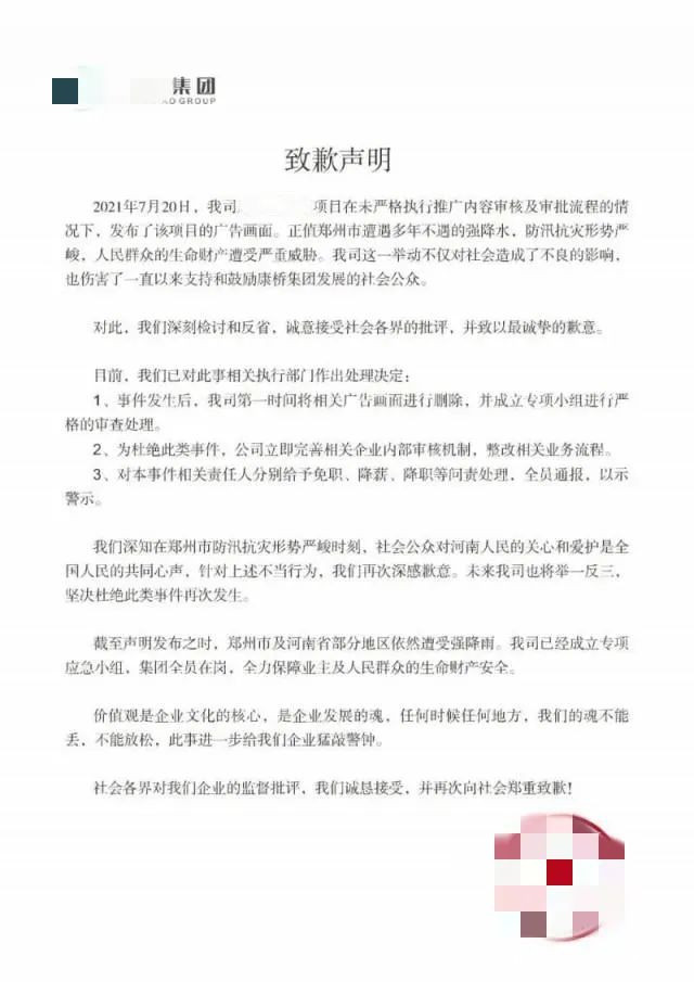 859人蔘與66評論7月20日河南遭遇特大暴雨,牽動全國人民的心。就在此時,河南當地某房企卻以“入住高地,讓風雨只是風景”為宣傳噱頭,引發眾怒。7月21日早間,該企業將宣傳廣告刪除併發布“致歉聲明”稱,已成立專項小組進行嚴格審查,對相關責任人予以免職、降薪、降職等問責處理。