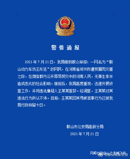 711人蔘與52評論遼寧省鞍山市公安局高新分局官方微博7月21日通報,今日,該局接到羣眾舉報:一網民在河南省鄭州市遭受暴雨災害之際,在微信羣內公開辱罵受災中的河南人民,無事生非並造成惡劣的社會影響。接報後,警方高度重視,迅速開展偵查工作,並將違法嫌疑人王某某查獲。經調查,王某某對其違法行為供認不諱。目前,王某某因其尋釁滋事行為已被警方行政拘留十日。