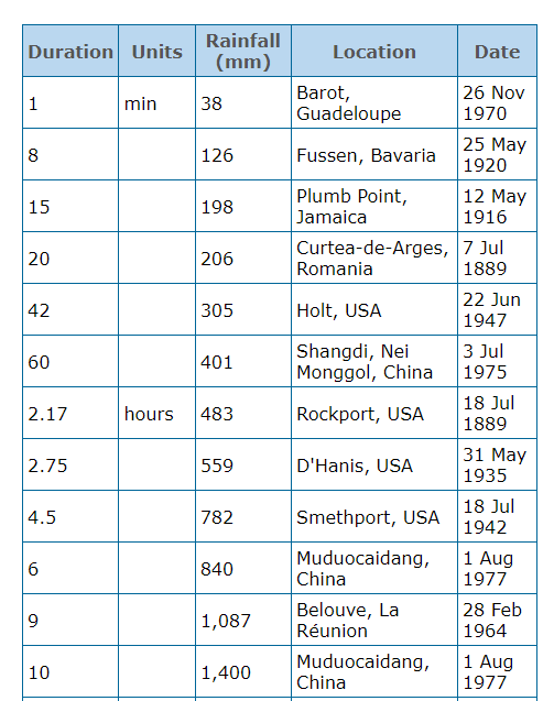 事實上,單小時降水201毫米,已經是中國有史以來最大的降水紀錄,在全世界的降水紀錄裏也能排得上號: