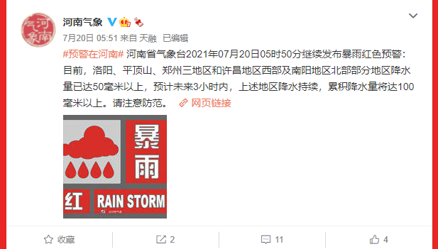 比如河南氣象明明一直在發佈暴雨警報。從橙色預警,上升到紅色預警: