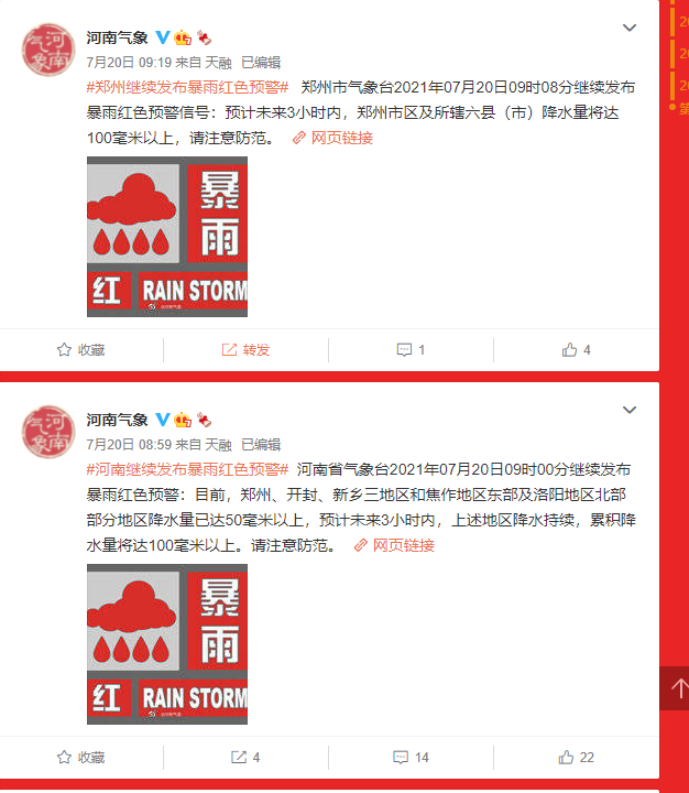 我數了一下,河南氣象從昨天凌晨到下午極端降雨之間,一共發了七個暴雨紅色警報,基本每隔一個小時就要發一個。