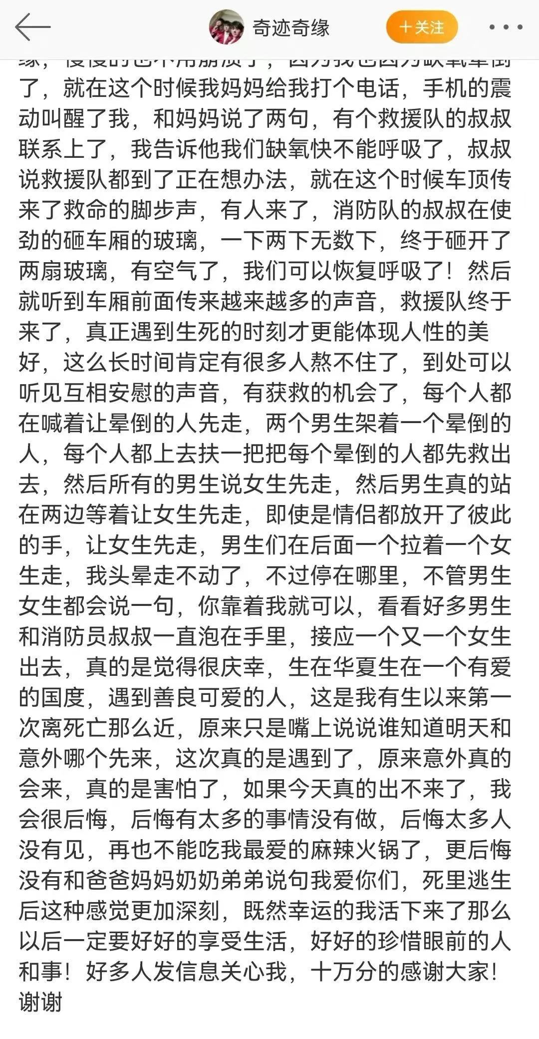 一直今天凌晨,一位被困乘客獲救後,寫了一篇長微博,開頭一句就是“寫在死裏逃生後”,中間每一句話都看得驚心動魄,所幸最後有驚無險。