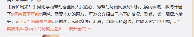 現在各個社交媒體都開通了求救通道,在微博上只要用#河南暴雨互助#為話題發東西,就可能得到幫助: