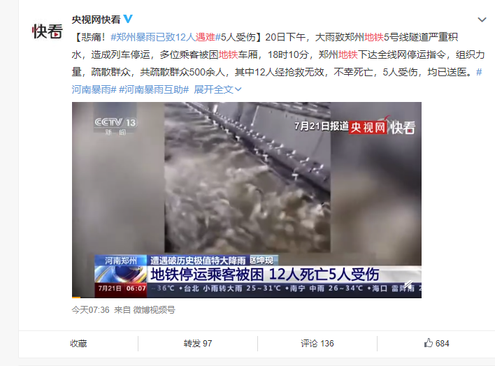 鄭州大暴雨已經造成了不少死傷,如果這些人沒有上班,沒有出門,也許其中不少悲劇可以避免。