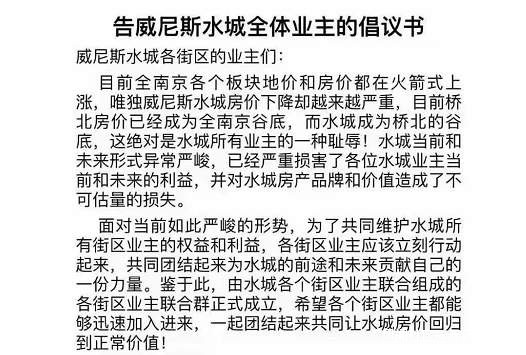 值得注意的是,根據近期網傳消息,5月下旬,威尼斯水城業主發出一封《告全體業主的倡議書》,號召各街區成立業主聯合羣,共同讓威尼斯水城房價迴歸到正常價值。