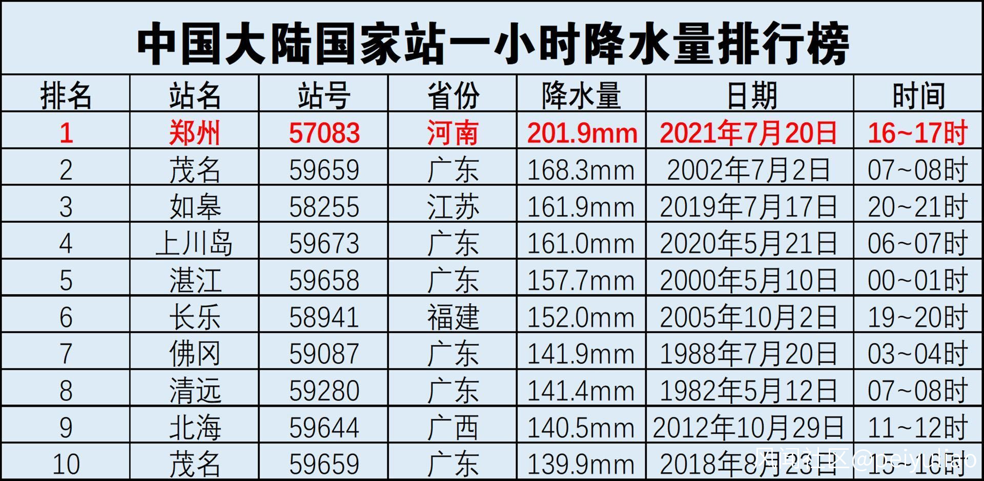 而從短時極端性看,16:00-17:00這一個小時裏鄭州國家氣象站錄得201.9毫米強降雨,這更是打破了內地國家級站點1小時降雨量的觀測最大值(圖2);