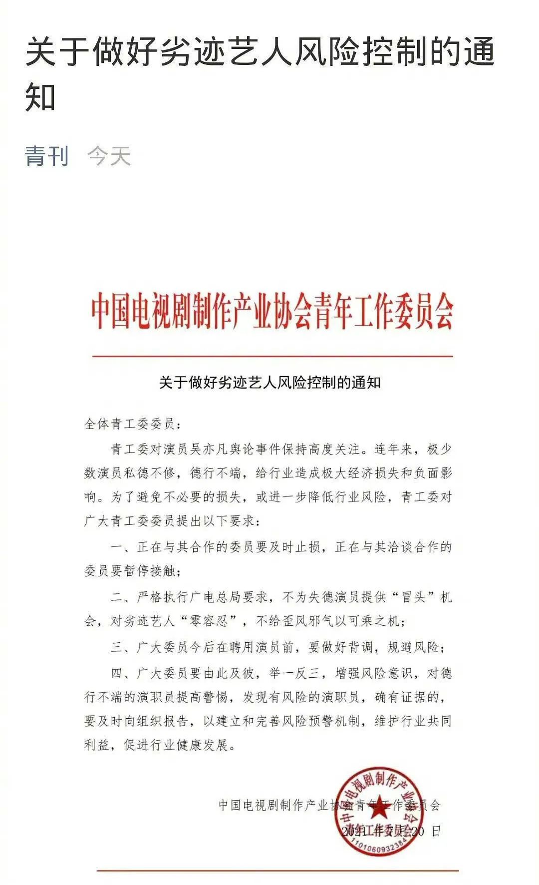20號,青工委(中國電視劇製作產業協會青年工作委員會)發出紅頭文件——《關於做好劣跡藝人風險控制的通知》。