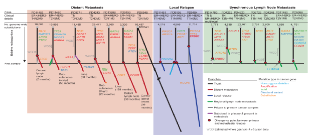 圖1.原發性乳腺癌轉移或局部復發的進化樹狀圖