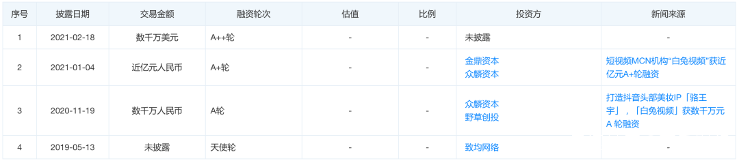 在美妝領域,值得關注的是,簽約抖音生態頭部美妝達人駱王宇的MCN白兔視頻,不到半年內獲得資本三輪持續加註。2020年11月,A輪融資數千萬人民幣,來自眾麟資本、野草創投;2021年1月,獲得近億元來自金鼎資本、眾麟資本的A+輪融資;2021年2月,獲得高榕資本的數千萬美元A++投資,目前公司估值2億美金。白兔視頻的創始人王傲延是前全民TV直播總裁,當年的平台倒閉跑路事件,並未影響如今資本對其在新賽道表現的信任。