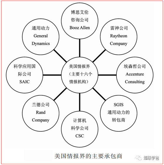 美國情報部門還非常重視民間的力量——服務外包。根據2008年美國國家情報總監辦公室的報告,有4萬家私有情報商,僱傭着265萬人從事着情報工作。