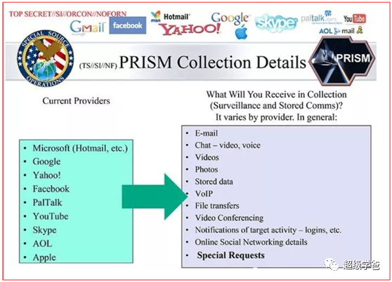 而“稜鏡計劃”,則是國安局通過美國互聯網科技公司(比如臉書、谷歌、微軟、蘋果、雅虎等)的服務器,實現對個人信息的收集和監控。