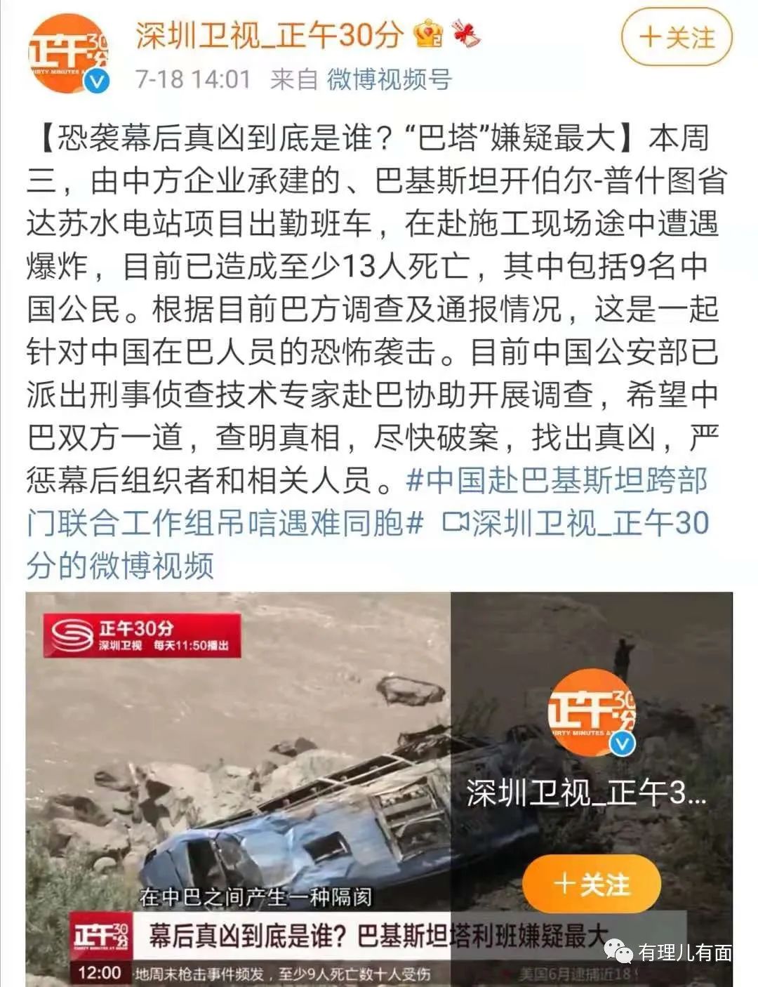 7月14日,中方企業承建的巴基斯坦達蘇水電站項目出勤班車,在赴施工現場途中遭遇爆炸,9名中國工作人員遇難。