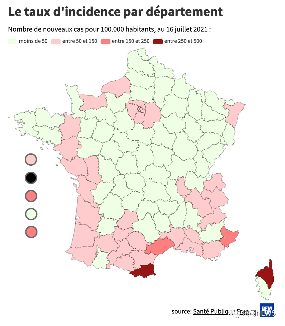 在暑假最受遊客歡迎的南部蔚藍海岸和巴斯克地區,新病例數量也在爆炸性增長。Les Pyrénées-Orientales省的發病率為345(5.1%的陽性率),7月9日至15日期間每天有205個陽性病例。當地省長Hugues Moutouh向BFMTV表示,在Hérault,週一的發病率超過了200,目前為201.4。Haute-Corse的情況也是如此,每10萬名居民中有266個病例。