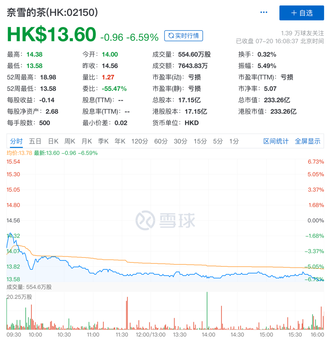 6月底,“新式茶飲第一股”奈雪的茶登陸港交所,但上市首日股價就破發,截至今日收盤報13.60港元,較其發行價19.8港元下跌超過30%,總市值233.26億港元。