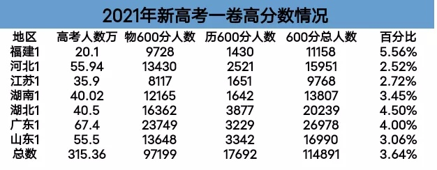 事情是這樣的,作為一個無所事事的退休人員,我偶然間刷到一篇文章,説今年由於江蘇高考採用了全國卷,結果考下來六百分以上人數比例很低,所以之前你們説江蘇考生有多牛淨是吹牛逼。他還附了參加今年新高考的幾個省600分以上考生的比例: