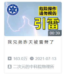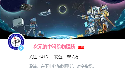 不僅是科普雜誌社,中國科學院也在B站大受歡迎,其中“頭牌網紅”中科院物理所在B站上的官方賬號叫做 “二次元的中科院物理所”,被網友們親切地稱為“中二所”。