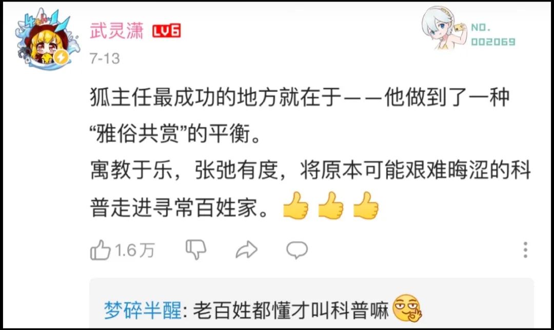 狐主任等科普UP主在B站的成功説明,無論是多硬核的科學知識,只要用對方式,一樣能散發魅力,吸引大批受眾。而傳播的關鍵就在於如何讓普通人也能聽懂。