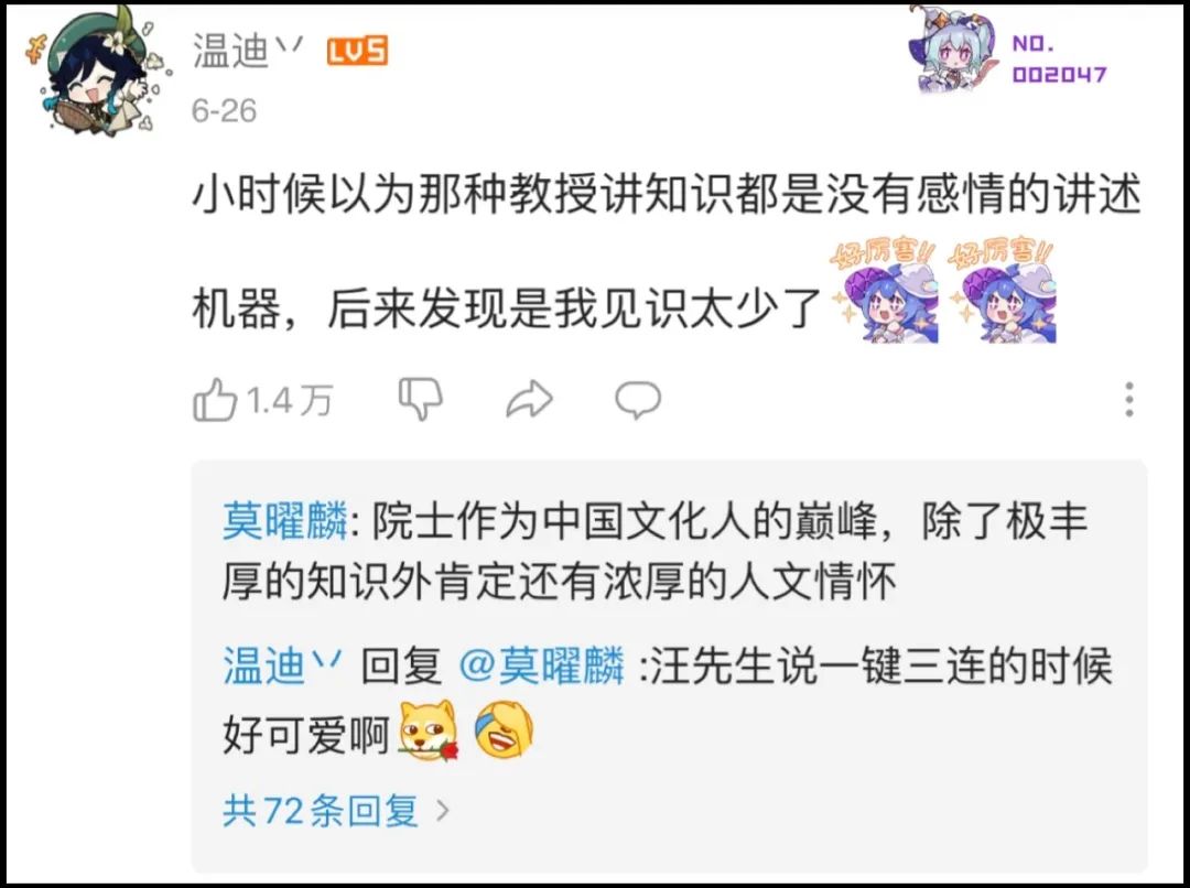 他選擇入駐B站,也是響應年輕學生們的呼聲。他們覺得汪院士這樣“接地氣”的寶藏科普不應該只停留在講台上,還應該在更大的媒體平台上讓更多人看到。