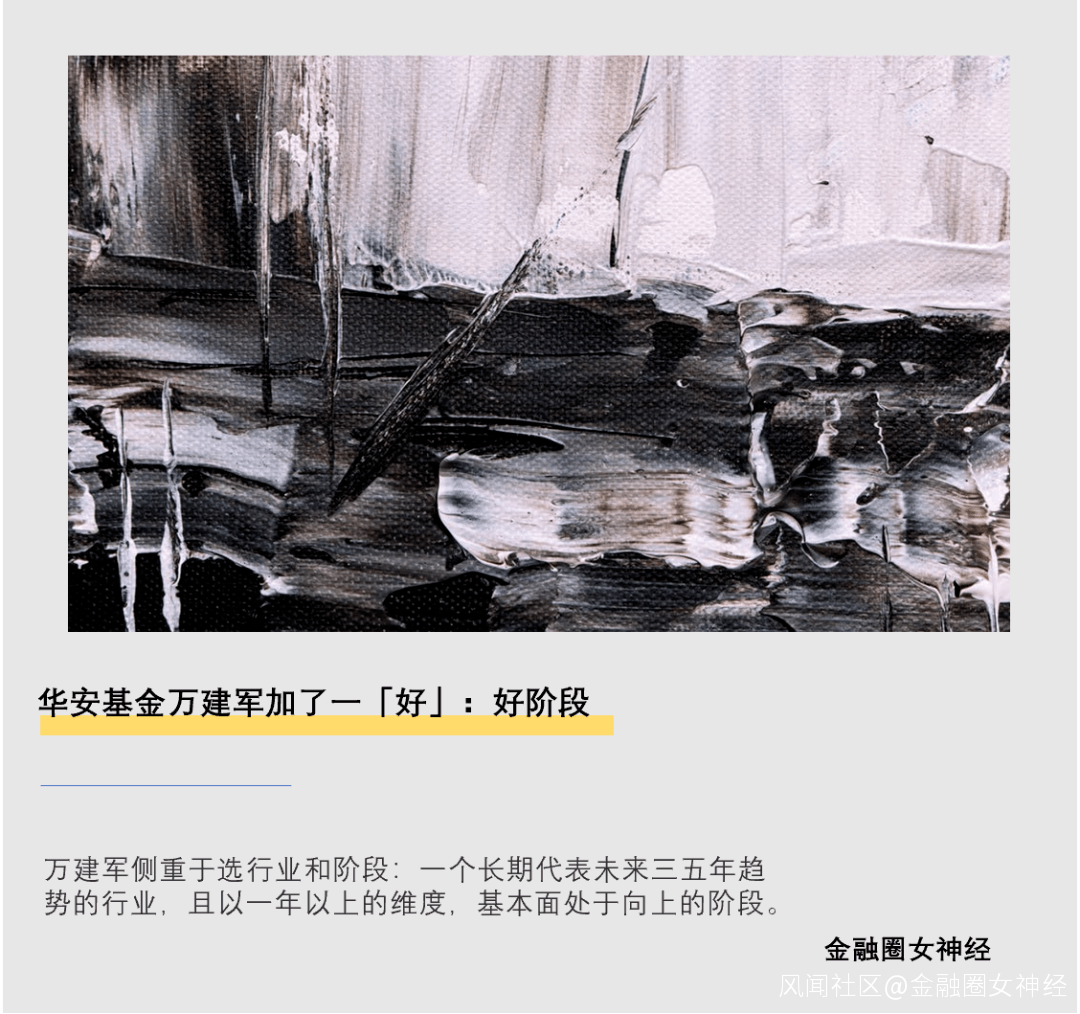 因此,萬建軍側重於選行業和階段:一個長期代表未來三五年趨勢的行業,且以一年以上的維度,基本面處於向上的階段。