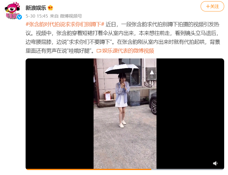 在這段視頻中,明星穿着夏日常見的短裙,卻不敢往前走,她不得不好言相勸,“求求你們了不要蹲下”,去“請求”對面一羣做下蹲狀、揮舞着手機、試圖讓鏡頭捕捉到更多裙下畫面的拍攝者們。