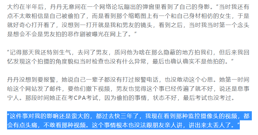 曾經看過一條新聞,一位女士無意間從網絡上看到了自己被偷拍的視頻,心理上難以接受,最後精神抑鬱,看到監控鏡頭或視頻就會感到恐懼。