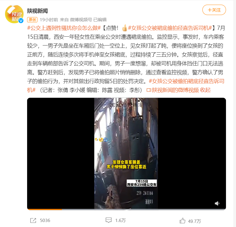 當警方趕到現場時,男子已經將手機中的偷拍照片悄悄刪除,試圖矇混過關,但公交車上的監控已經如實記錄下他的偷拍事實。最終,他被行政拘留5日。