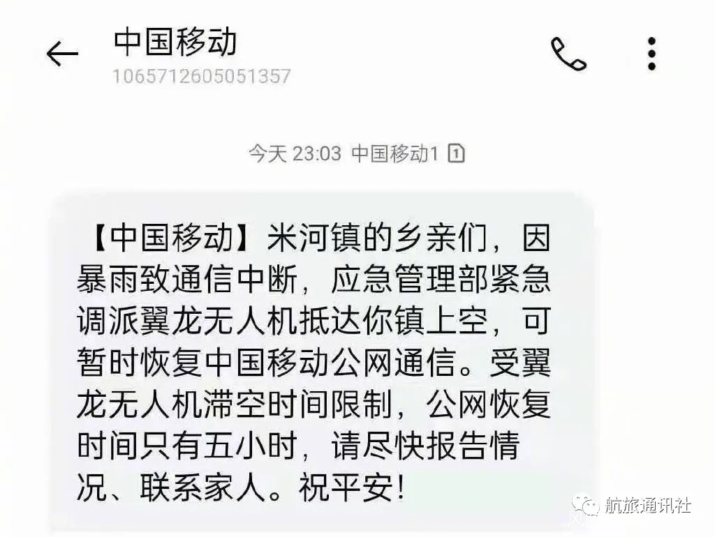 不少人收到一條短信“應急管理部緊急調派的翼龍無人機抵達你鎮上空,可暫時恢復公網通信……請儘快報告情況、聯繫家人”,彷彿是科幻片裏的場景。
