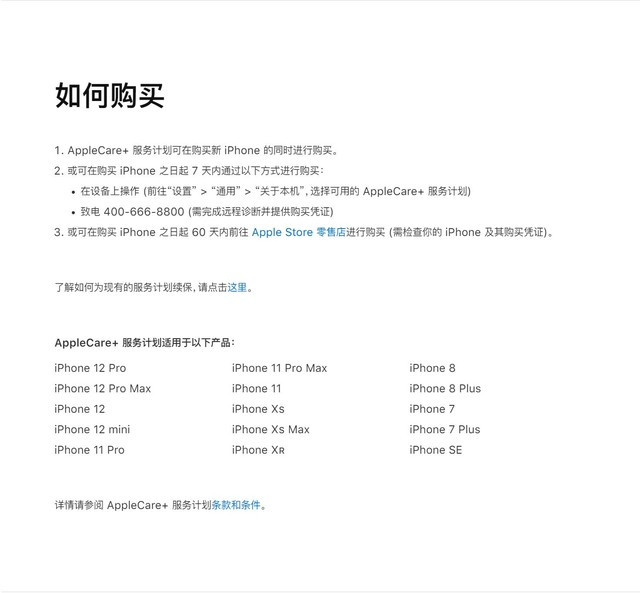 上面就是蘋果之前一直執行的AppleCare +服務計劃政策。但是現在這項政策針對中國大陸市場發生了些許改變,從設備購買之後60天的在線購買期限變成了七天之內可以在線進行購買,線下購買的期限沒有改變。相比於之前的服務政策,新修改的政策無疑是縮水了。我還需要説的一點就是,這項政策的調整隻針對國內,其他大量海外地區仍然支持60天內的線上購買政策。