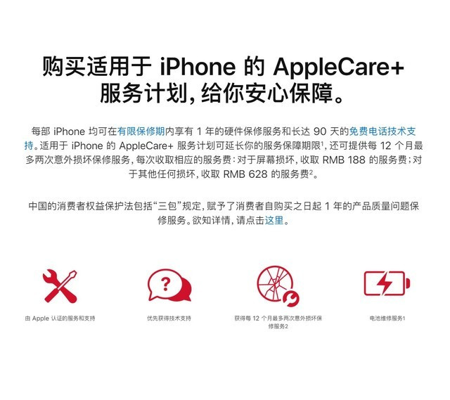 用户購買AppleCare +服務計劃以後可以獲得長達兩年的額外硬件保修和軟件支持服務,並且每12個月內最多可以進行兩次意外損壞保修服務,可以以較為低廉的價格對意外損壞的iPhone進行維修。簡單來講,AppleCare +就是蘋果所推出的官方意外損壞保修服務。當用户購買蘋果設備以後,可以選擇在購買設備時一併購買這項服務計劃,或者在設備購買之日起60天之內在線購買或去Apple Store零售店進行購買。