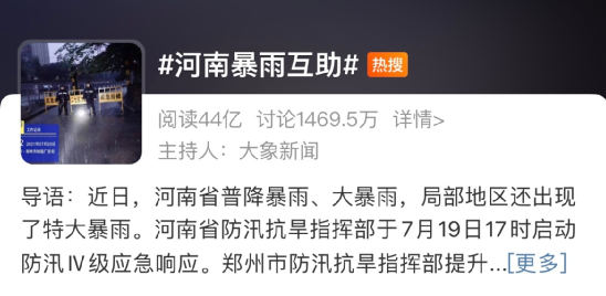 微博上,#河南暴雨互助#話題,一天之內已經有44億閲讀量,1400多萬條討論。