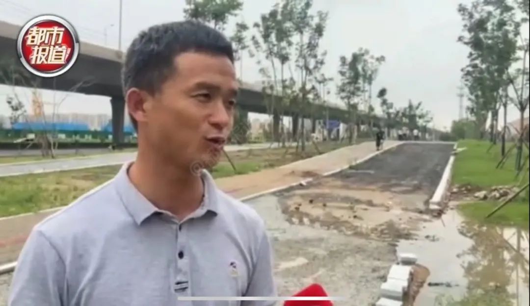 一位市民冒雨守在井邊,還搬來兩輛共享單車擋住井口,為來往的車輛行人示警。