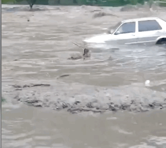 行駛途中,路面的水勢突然變大,他的車被衝到了溝裏。水流很急,他的車漂了起來。